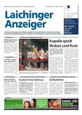 Jeden Mittwoch kostenlos in 11 500 Haushalten Mittwoch, 19. Januar 2011 Laichinger Anzeiger Die Wochenzeitung der Schwäbischen Zeitung für Laichingen Berghülen, Merklingen, Nellingen, Heroldstatt, Hohenstadt, Römerstein, Westerheim, Oberdrackenstein, Ingstetten und Justingen Marktplatz 15 D-89150 Laichingen Telefon 07333/5433 zahnarzt-schleifer@t-online.de Wir freuen uns auf Ihren Besuch! Liederkranz Merklinger Sänger spielen Theater MERKLINGEN (la) – Der Liederkranz Merklingen lädt auch in diesem Jahr wieder zu seiner Jahresfeier in die Gemeindehalle Merklingen ein. Der Gemischte Chor, der Song Circle und die Laienspielgruppe haben wieder ein unterhaltsames Programm zusammengestellt. Seite 3 Krankenhaus Dr. Winter spricht über Akupunktur BLAUBEUREN (la) – Am Mittwoch, 19. Januar, findet im Konferenzraum des Gesundheitszentrums Blaubeuren ein Vortrag zum Thema „Akupunktur“ statt. Referent ist Dr. med. Markus Winter, Chefarzt der Fachabteilung Anästhesie im Kreiskrankenhaus Blaubeuren. Seite 4 Musikverein Stadtkapelle Laichingen Unter der Leitung von Gerhard Engler bietet die Stadtkapelle Laichingen ein stimmungsvolles Konzert. LA-Foto: arc Kapelle spielt Walzer und Rock LAICHINGEN (la) – Am Samstag, 22. Januar, lädt der Musikverein Stadtkapelle Laichingen zu seinem Jahreskonzert in die Daniel-Schwenkmezger- Halle ein. Beginn ist um 19.30 Uhr. Das Motto lautet in diesem Jahr „Johann Strauss meets Symphonic Rock“. Den Auftakt machen die Nachwuchsmusiker unter der Leitung von Michaela Bönisch mit dem „Blockflötenrap“. Es folgen drei Stücke, bei denen jeweils Soloparts von Klarinette, Posaune und Horn sowie Querflöte zu hören sind. Gerhard Engler hat mit seinen Musikerinnen und Musikern ein anspruchsvolles und breit gefächertes Programm erarbeitet. Mit dem Konzertmarsch „Arsenal“ beginnt der Part der Stadtkapelle, gefolgt von der dramatischen Ouvertüre „The Saint and the City“. Im Anschluss erklingen die Highlights aus dem Musical „Mozart“ und eine Zusammenstellung verschiedenster Strauß- Walzermelodien. Mit einem Querschnitt durch die Musik von Bryan Adams geht es nach der Pause weiter. Rockig wird es nach den Ehrungen verdienter Mitglieder mit Highway to Hell, Smoke on the Water und Born to be Wild. Zum Abschluss erklingt das Werk „Symphonic Rock“ mit Musik von Queen und Genesis. Man darf gespannt sein auf die Laichinger Variante von „Innuendo“ oder „We are the Champions“. Heute in der SZ Bogenschützen kurz vor dem Aus LAICHINGEN – Finden die Bogenschützen in den nächsten Wochen kein neues Trainingsgelände, steht der neu gegründete Verein vor dem Aus. Denn den rund 30 Mitgliedern fehlt die Grundlage für ihren Sport: ein Trainingsgelände. Seit der Trennung von der Schützengilde Laichingen sind die Bogensportler heimatlos. Ausstellung im Servicehaus Sonnenhalde Kunst im Servicehaus WESTERHEIM (la) – Bis zum 10. April läuft die Ausstellung der beiden Laichinger Künstler Andrea Bräuning und Rudolf Kosow, die Regine Autenrieth als Kunst- und Projektleiterin des Servicehaus Sonnenhalde am Wochenende eröffnet hat. Zu sehen sind Tierportraits von Andrea Bräuning. Diese zeigen ganz spezielle Charakter und beeindrucken vor allem mit ihren Augen, deren Blicke den Betrachter in ihren Bann ziehen. Die Werke von Rudolf Kosow sind in einem völlig anderen Stil gehalten. Ikonen gleich, Ton in Ton gehalten und großformatig lassen sie den Betrachter staunend zurücktreten und verführen zum Träumen. Die Woche in der Schwäbischen Zeitung SZ-Rückblick ◆ LAICHINGEN - Zum 16. Mal werben die Gemeinden des Alb- Donau-Kreises auf der Urlaubsmesse CMT in Stuttgart mit einem gemeinsamen Stand. Wandern, Sport und Abwechslung will der Tourismus bieten. ◆ MERKLINGEN – Die IGM stellte vor Gästen aus den Umlandgemeinden ihren Film mit Heimatforscher Rainer Mauch vor. Mehr Informationen finden Sie jeden Morgen in der Schwäbischen Zeitung. Sie können ein kostenloses 14- tägiges Probeabonnement anfordern unter der Telefonnummer 0180/2008001. Anzeige