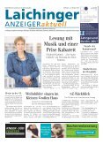 Jeden Mittwoch kostenlos in 12.000 Haushalten Mittwoch, 21. Oktober 2015 Laichinger ANZEIGERaktuell Die Wochenzeitung der Schwäbische Zeitung für Laichingen, Berghülen, Merklingen, Nellingen, Heroldstatt, Hohenstadt, Römerstein, Westerheim, Oberdrackenstein, Ingstetten und Justingen Elisabeth Kabatek liest im Alten Rathaus. FOTO: V. SCHRANK Lesung mit Musik und einer Prise Kabarett Elisabeth Kabatek – „Zur Sache Schätzle“ am Dienstag im Alten Rathaus LAICHINGEN (la) - Mit ihrem Debüt „Laugenweckle zum Frühstück“ startete Elisabeth Kabatek ihre eigentlich als Trilogie geplante Reihe um Pipeline Praetorius. Jetzt liegt der vierte Teil „Zur Sache Schätzle“ vor, der nahtlos an „Brezeltango“ anschließt. Am Dienstag, 27. Oktober, um 19.30 Uhr liest sie auf Einladung der Stadtbücherei, der Vhs und der Buchhandlung Aegis aus ihrem aktuellen Buch im Alten Rathaus. Mit dabei: Sängerin Susanne Schempp. Elisabeth Kabatek ist eine genaue Beobachterin der Schwaben und sie ist auch in diesem Roman ihrem Stil treu geblieben. In und um Stuttgart, der "wildesten Stadt Deutschlands", lebt die Protagonistin Line mit Hund und Katz. Und zieht Katastrophen vollautomatisch an. Elisabeth Kabateks Laugenweckle-Reihe ist zum Kult geworden und ihre Lesungen sind genauso sprühend und witzig wie ihre Bücher. Der Eintritt beträgt acht Euro. Kartenvorverkauf bei der Buchhandlung Aegis, der Stadtbücherei und der VHS. Marktplatz 15 89150 Laichingen Telefon 07333/5433 zahnarzt-schleifer@t-online.de www.facebook.com/ ZahnarztpraxisAm- MarktplatzKSchleifer Zahngesund durchs Jahr! Stunde der Kammemusik LAICHINGEN (la) - Isabel Stürzl (Sopran) und Patrick Wörz (Klavier), zwei achtzehnjährige Talente aus Laichingen, musizieren in der nächsten „Stunde der Kammermusik“. Diese findet am kommenden Sonntag, 25. Oktober, um 11 Uhr statt. Seite 3 Oktoberfest in der Berghalle HEROLDSTATT (la) - D’Lena und d’r Maddeis, das sind seit zehn Jahren Hillus Herzdropfa. Das schwäbische Komikerduo gastiert am Samstag, 24. Oktober, um 20 Uhr in der Berghalle in Heroldstatt. Am Sonntag, 25. Oktober, feiern die Sontheimer Musiker ihr Oktoberfest. Seite 5 Heute in der SZ LAICHINGEN (sz) - Eine Gefahrenquelle stellt für Kinder und Jugendliche der Schulweg dar, wenn sie von der Neubausiedlung Lindensteig über die Olgaund die Schulstraße unterwegs sind. Das Problem kennt auch die Stadtverwaltung. Sie sieht jedoch keine Möglichkeit, für mehr Sicherheit zu sorgen. Zwar befindet sich ein Gehweg im Bereich der Schulstraße, jedoch nur auf der „ungünstigen“ Straßenseite. Weibsbilder singen im Kleinen Großen Haus Konzert am Samstagabend und am Sonntagnachmittag BLAUBEUREN (la) - In einer bunten Revue präsentiert der vhs-Chor unter Leitung von Beate Schneck am Samstag, 24. Oktober um 20 Uhr und am Sonntag, 25. Oktober, um 16 Uhr Lieder und Texte zum Thema „Frauen (und Männer)“. Am Samstagabend serviert Ingeborg Eckert kleine Häppchen und Getränke, am Sonntag gibt’s Kaffee und Kuchen. Der Eintritt kostet sieben Euro, Vorverkauf: Bücherpunkt Blaubeuren, Karlstr. 6; vhs-Büro Laichingen, Radstr. 8. SZ-Rückblick Die Woche in der Schwäbischen Zeitung LANDKREIS (sz) - Kreistag unterstützt Seifferts Flüchtlingskurs. Lob und Anerkennung für Ehrenamtliche - Fast keine Unterkünfte mehr frei. RÖMERSTEIN (sz) - Römerstein erwartet 80 Asylbewerber. Bürgermeister Winter will dezentrale Unterbringung in allen drei Ortsteilen. LAICHINGEN (sz) - Der weibliche Machtkampf. Vor etwa 100 Frauen zeigt Referentin auf, wieso machtbewusste Frauen nicht zu unterschätzen sind. Mehr Informationen finden Sie jeden Morgen in der Schwäbischen Zeitung. Sie können ein kostenloses 14-tägiges Probeabonnement anfordern unter der Telefonnummer 0751 / 2955 5555. Fenster und Haustüren für die Lieblingscousine! Bauherrenberatung Samstags von 7.30 - 14.00 Uhr Kostenlos und ganz unverbindlich. Verkauf nur über den Fachhandel. Neue Ausstellung! KNEER GmbH · Fenster und Türen · Horst-Kneer-Straße 1 · 72589 Westerheim Tel. 0 73 33/83-0 · Fax 0 73 33/83-40 · info@kneer.de