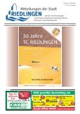 Mitteilungsblatt der Stadt Riedlingen KW 22 /19 Mittwoch, 29. Mai 2019 | 14 Freikirche der Siebenten-Tags-Adventisten Haldenstr. 12-14, 88499 Riedlingen Kontakt: David Hoffmann, Tel. 07371/96638 Freikirche der Siebenten-Tags-Adventisten Haldenstrasse 12-14, 88499 Riedlingen Kontakt: David Hoffmann, Tel. 07371/96638 Montag den,03 . 06. 2019 18:00 Uhr Bibelstunde mit Gedankenaustausch. Daueraktion „Kinder helfen Kinder“ Auch in diesem Jahr 2018 können Sie wieder bei unseren Aktion „Kinder helfen Kinder“ mit kleinen Dingen eine große Freude bereiten. Päckchen abholen und abgeben im „Buch und Teeladen“ Haldenstr. 12-14 _______________________________________________________ Jehovas Zeugen Königreichssaal - Riedlingen- Beethovenstr.24 Freitag, 31.5.2019 19.30 Uhr Zusammenkunft unter der Woche Sonntag, 2.6.2019 09.30 Uhr Biblischer Vortrag: Was bewirkt die Wahrheit in unserem Leben? Interessierte Personen sind herzlich willkommen. Keine Kollekten www.jw.org Gemeinsame Familien-Zeit Am Samstag, den 1.Juni, bietet die Seelsorgeeinheit Riedlingen einen Ausflug für Familien an. Treffpunkt ist um 12.45 Uhr am Riedlinger Bahnhof. Mit dem Zug geht´s um 13.08 Uhr nach Sigmaringen (Ankunft gegen 13.30 Uhr). Der Weg führt vom Bahnhof durch die Innenstadt vorbei am Schloss zur Donau. Ziel ist der „Schaukel-Pfad“, der in (verkürzter Form) erkundet wird. Vorläufige Endstation sind der der Abenteuerspielplatz am Bootshaus und der nahegelegene Kneipp-Garten. Die Rückfahrt ist für 17.30 Uhr geplant. Der Nachmittag soll in erster Linie Möglichkeit bieten, sich als Familie bewusst Zeit füreinander zu nehmen, alte Bekannte zu treffen und neue Gesichter kennenzulernen, gemeinsam unterwegs zu sein und miteinander zu spielen. Bei schlechtem Wetter (Regen!) wird der Ausflug auf Samstag, den 8. Juni, verschoben. Um besser planen zu können, wird um Anmeldung bis Mittwoch, 29.Mai, gebeten. Kontakt: Pastoralreferentin Claudia Wendt-Lamparter (Tel. 07371 / 9335-12; Mail: claudia.wendt-lamparter@drs.de) Sonntag, 02.06. 10.00 Uhr Wort- und Kommunionfeier Donnerstag, 06.06. 19.00 Uhr Eucharistiefeier in der Kapelle Pfarrbüro Daugendorf Öffnungszeiten: Di. und Do.: 09.00 - 11.30 Uhr Mittwoch: 15.00 – 17.30 Uhr Tel. 07371/2249 Fax: 07371/966 728 E-Mail-Kontakt: pfarramt.daugendorf@drs.de Beerdigungsdienst 28.05. – 31.05. Patricia Engling Beerdigungsdienst 04.06. – 07.06. Patricia Engling Grüningen Daugendorf SV Daugendorf SGM SV Daugendorf/ TSG Zwiefalten: Aufgrund des vorgezogenen Redaktionsschlusses wegen des Feiertages Christi Himmelfahrt bitte die Ergebnisse für die Spiele Kreisliga A1 Donau Res., 28. Spieltag, Sonntag 26.05.2019, 13:15 Uhr SGM TSV Ertingen / SV Binzwangen II - SGM SV Daugendorf / TSG Zwiefalten II Kreisliga A1 Donau, 28. Spieltag, Sonntag 26.05.2019, 15:00 Uhr SGM TSV Ertingen / SV Binzwangen - SGM SV Daugendorf / TSG Zwiefalten in der Tagespresse/ Homepage und Facebook nachschauen. Vorschau: Am 29. Spieltag KL A1 Donau und Reserve am 02.06.2019 hat die SGM SV Daugendorf/ TSG Zwiefalten spielfrei! A-Junioren JSG Daugendorf/ Riedlingen/ Neufra Bezirksstaffel 18. Spieltag Samstag, 01.06.2019 um 17.00 Uhr in Bad Buchau SGM Bad Buchau - Federsee - SGM Daugendorf/Riedlingen/Neufra _______________________________________________________ Kirchliche Nachrichten Kath. Kirchengemeinde Daugendorf St. Leonhard Mittwoch, 29.05. Bittwoche 19.00 Uhr Bittgang nach Bechingen Donnerstag, 30.05. Christi Himmelfahrt 10.00 Uhr Eucharistiefeier anschl. Öschprozession. Kirchengemeinde Grüningen St. Blasius Tel.-Nr. 07371-9335-0 E-Mail: stgeorg.riedlingen@drs.de Donnerstag, 30. Mai – „Christi Himmelfahrt“ 08.45 Uhr Eucharistiefeier in St. Blasius anschließend Prozession Samstag, 01. Juni – Vorabendmesse zum 7. Sonntag der Osterzeit 13.00 Uhr Trauung von Lena Thanner u. Achim Blech in St. Blasius Herzlichen Glückwunsch 19.00 Uhr Eucharistiefeier in St. Blasius Wir gedenken im Gottesdienst: Albert Blersch Dienstag, 04. Juni 17.30 Uhr Rosenkranz 18.00 Uhr Abendmesse in St. Blasius Neufra FUSSBALLVEREIN NEUFRA/DO. e. V. Waldstadion Open Air 2019: Kuchenspenden: Für das Waldstadion Open Air im Juli, benötigt der FVN für den Aufund Abbau und während der Veranstaltung (von Mi. - So.) zahlreiche Kuchen. Wer Lust und Zeit hat und den FVN mit einer Kuchenspende unterstützen möchte, kann sich ab sofort bei Petra Kinzinger,